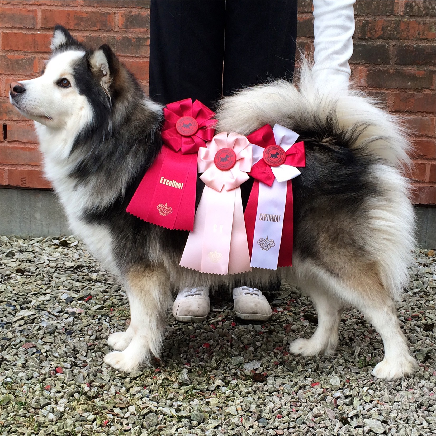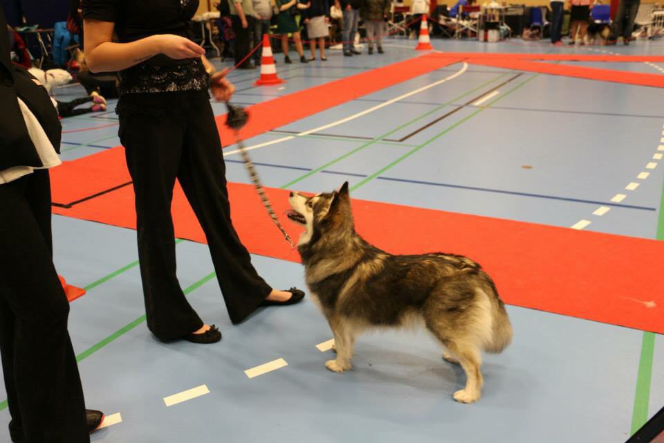 Yenka fäller all underull nu så henne hade jag inte stora förhoppningar på. Hon skötte sig super i ringen. Pigg och alert som vanligt. Hon fick ett Good, då domaren tyckte hon var för klen över huvudet, dålig benstomme och lite lång. Utan päls ser man ganska klen ut och hon behöver mer tid. Så detta är bara bra träning 🙂 super nöjd med henne.