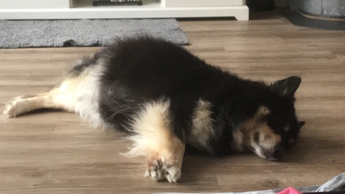 Söndagen 15/9, dag 61. Temp runt 36.7 i några timmar så tänkte att nu är de igång. Valpar inom 24h. Hela dagen gick och det blev måndag, dag 62. Hon var lite mer orolig nu men fortfarande inget vatten eller krystvärkar. Hon kom och satte sig vid mig på lakanet så bad henne sätta sig i bädden. Då upptäcker jag gröna flytningar. Hade de varit ljusgröna hade jag varit lugn men detta var ganska mörkgrönt precis som orkidéernas blad. Ringde veterinären och förklarade läget. Lite mer än 24h har gått sen sänkan och de tyckte jag skulle komma direkt.