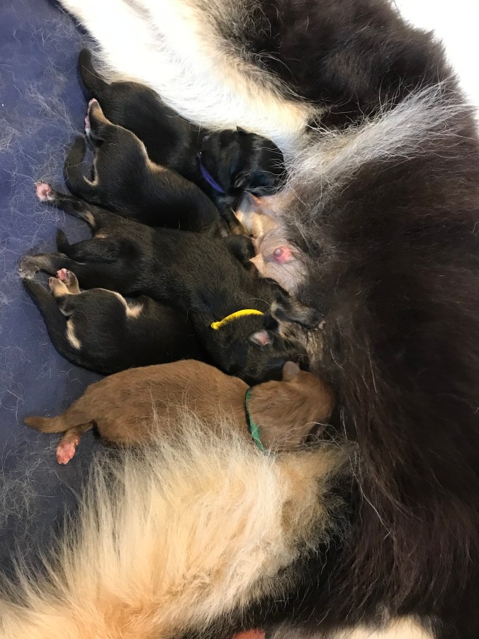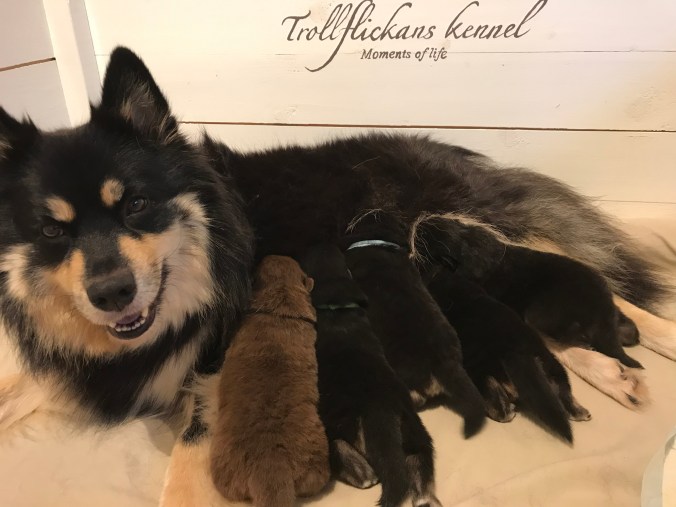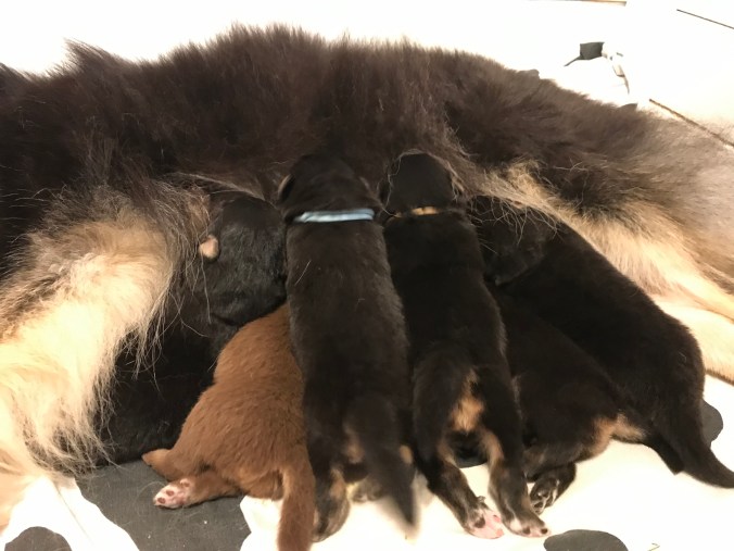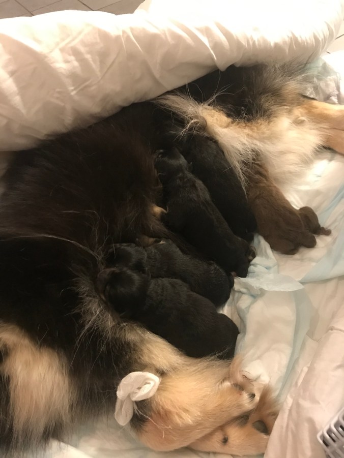 De kände ingen valp i gången och inga sammandragningar kunde de känna heller trots att hon var helt öppen. Vi tog en röntgenbild och där kunde vi räkna valparna till 5-6 st, precis vad jag trodde. De såg också att en valp låg krökt mot utgången och frågade mig vad jag ville göra. De kunde absolut sätta henne på dropp och försöka få igång henne men eftersom hon inte satt igång själv och att valpen låg som den låg var veterinären orolig om de skulle hjälpa, och vänta några timmar för att sen snitta henne är kanske försent för någon valp iom att det var så grönt flytningarna. Så jag tog det tunga beslutet att ta kejsarsnitt. Hon var så pass pigg så de är snällast mot henne. Veterinären sa att et var ett perfekt kejsarsnitt. Allting gick enkelt. Den valpen som blockat vägen var dock lite medtagen men kom snabbt igång. 6 valpar, 2 svarta tikar, 3 svarta hanar och 1 brun hane. Alla friska och pigga. Avanti tog hand om valparna direkt hon vaknade upp från narkosen. Fantastiska hund!! Veterinären var chockad över att de gick så fort att acceptera dem iom förstföderska. Stolt över min fina tjej. Hon är en fantastiska mamma.