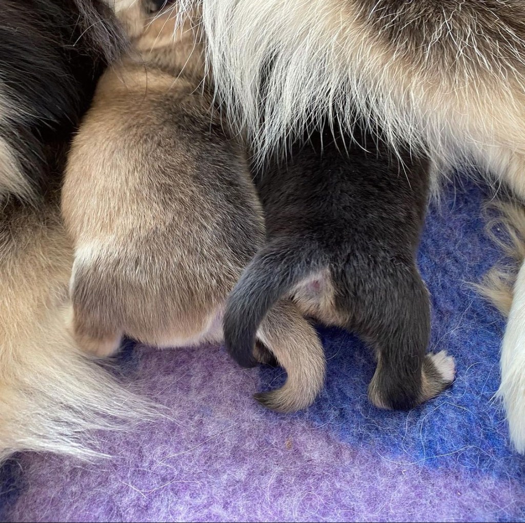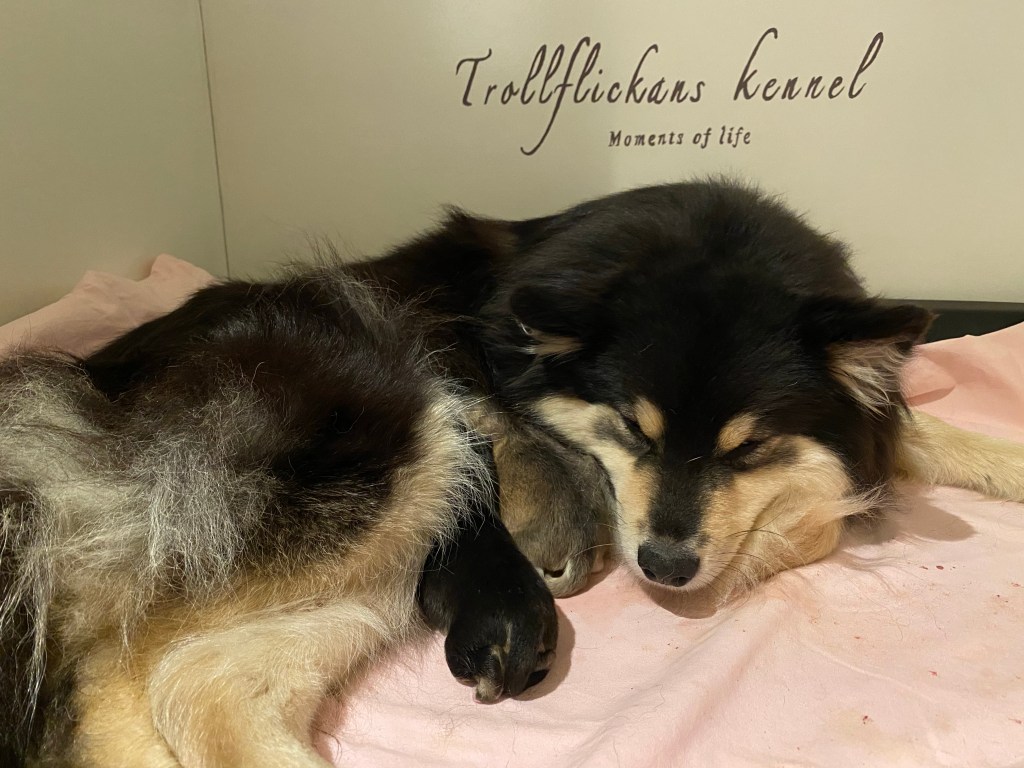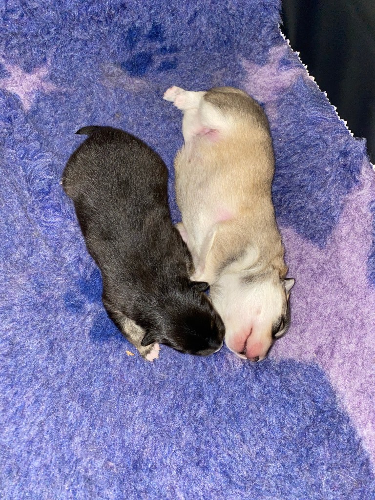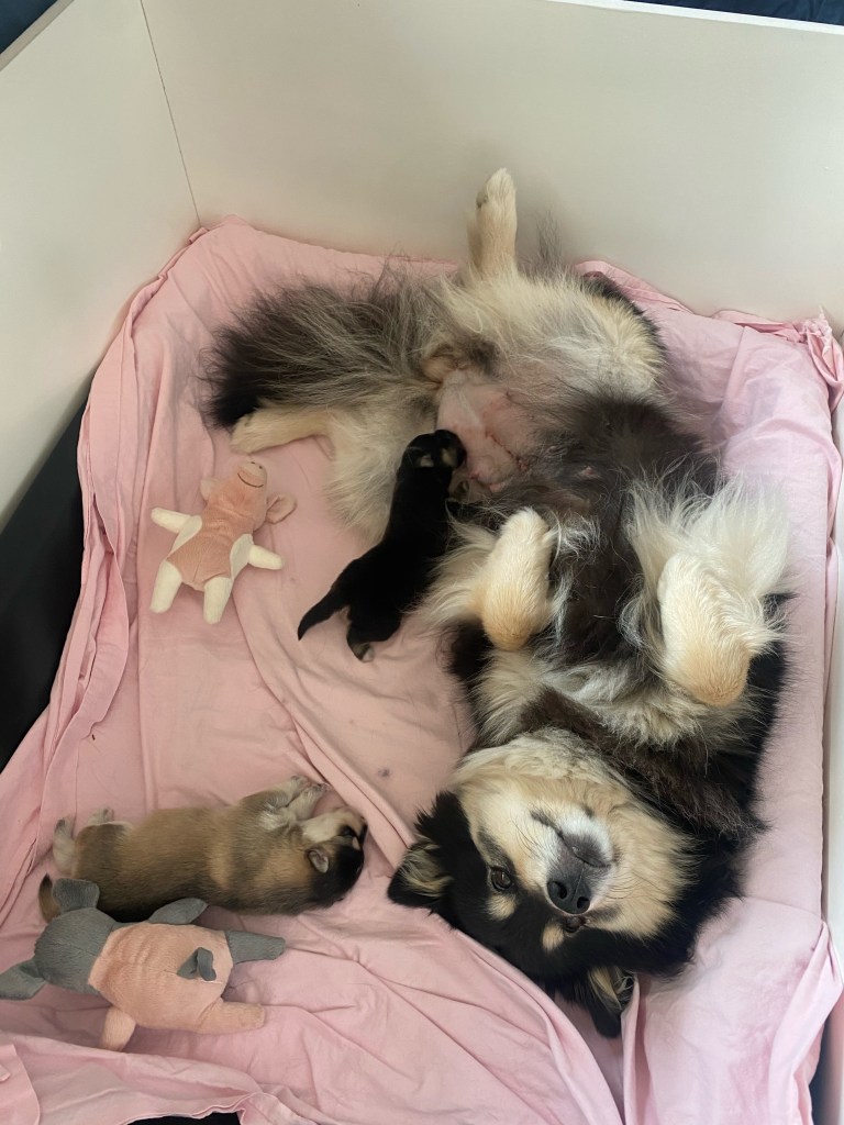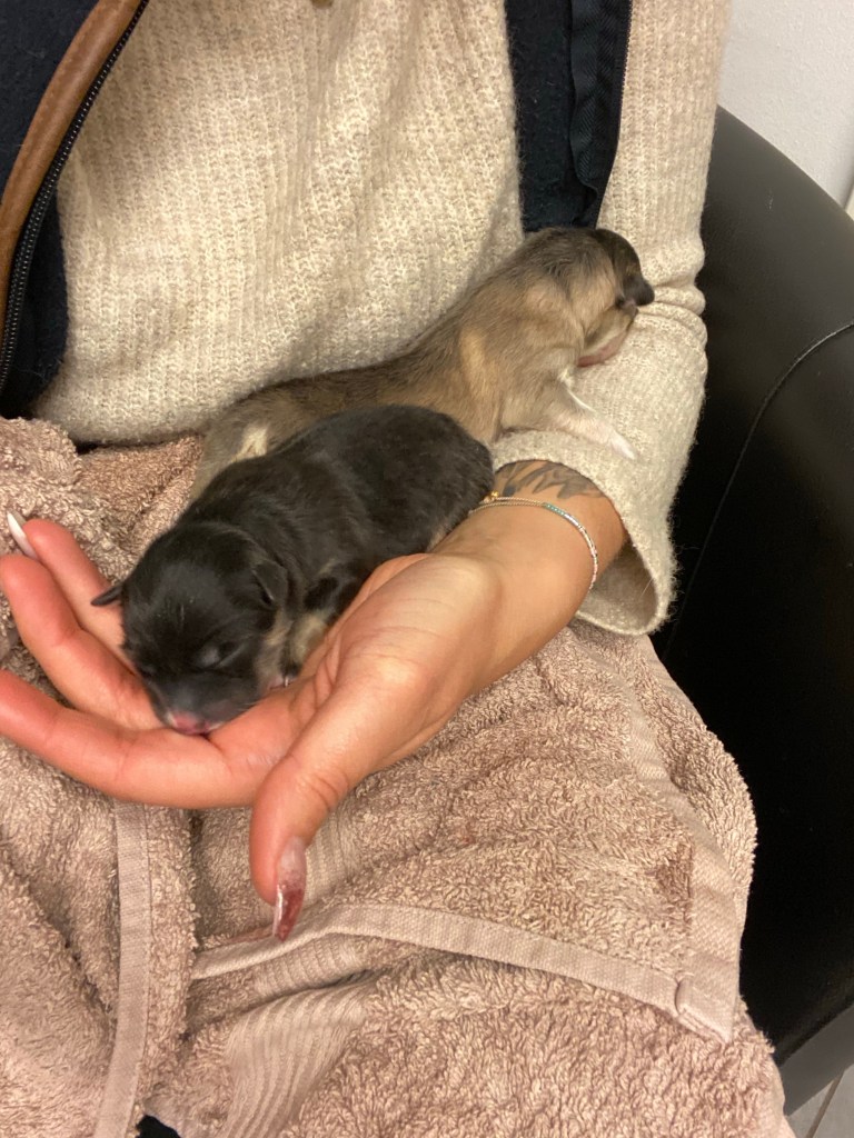 Så vi beslutade att göra kejsarsnitt på henne för att rädda den sista valpen och för att Shiera ska klara det. Vi hör ett valpskrik och pustar ut av lättnad. veterinären kommer ut och frågar om vi hör!? Jaaa vi hör så skönt att den lever. Ja de båda två lever!! VA?? Båda? Ja och de är två hanar. Överlyckliga att båda valparna överlevt men chockade över två hanar, jag som så gärna ville ha en tik efter dessa föräldrarna 🤣