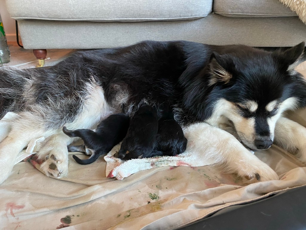 Efter första valpen var Clio redan rätt trött. Stor tik som kom med rumpan först. 2 timmar senare kommer det två fosterblåsor och jag tänkte för mig själv att två valpar kan inte komma ut samtidigt!! Tack och lov så pressades den ena fosterblåsan tillbaka när den andra kom men den hade spruckit så jag var orolig över den valpen. När andra valpen kom började det att sippra blod från clio, jag checkade det och det var rätt och inte grönt. Bra! Då är de ingen valp som börjar dö för mig. Efter 1.5 timme börjar jag bli orolig för den sista valpen. Då ser jag att Clio börjar krysta och fosterblåsan börjar synas. Grön och en massa saker i den. Valpen kommer ut och är helt grön och hade bajsat i vattnet. Men mådde bra! Båda hanarna kom baklänges och uppochner. Så de var tufft för Clio men hon var så duktig ❤️