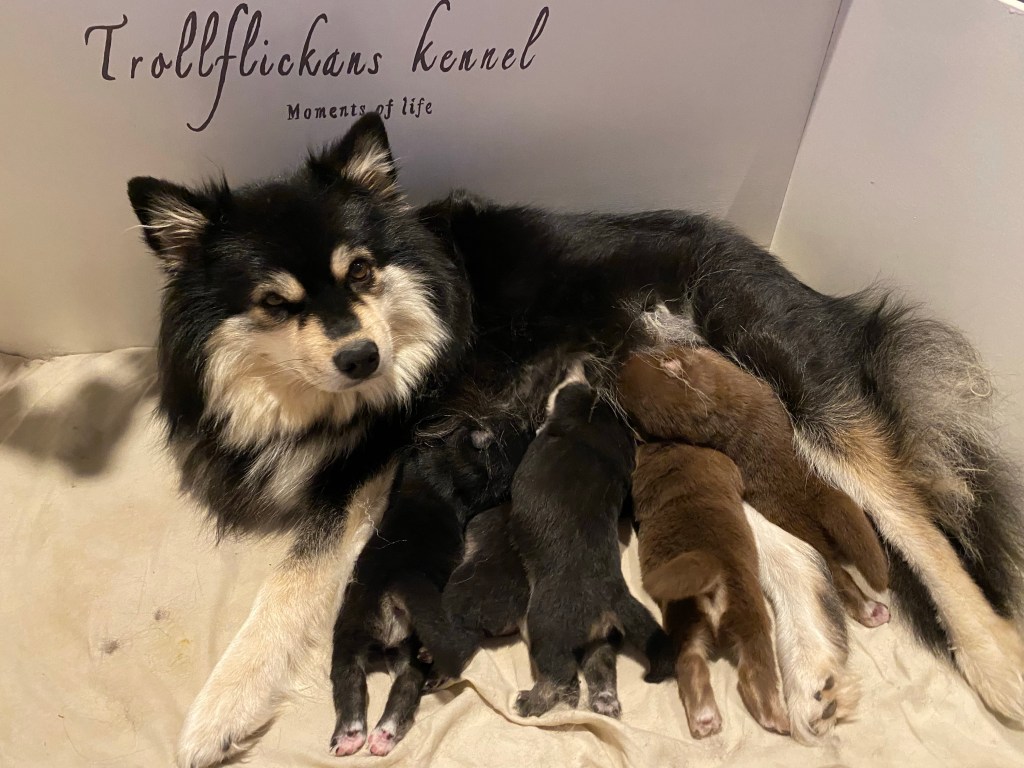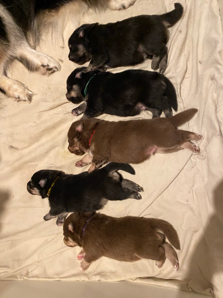 Det blev en tik och fyra hanar. Finns det intresse av en hane så hör av er 🥰 De tjocka små korvarna blev två veckor igår och har börjat öppna ögonen och balanserar på alla fyra istället för att åla sig fram 💪🏻
